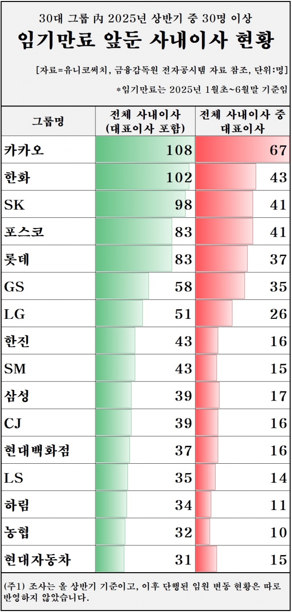 한편 카카오는 임기 만료를 앞둔 사내이사만 108명(대표이사급 85명)으로 조사대상 기업 가운데 가장 많았다. 한화그룹은 102명, 포스코 83명(대표이사 41명), 롯데 83명(37명), GS 58명(35명), 한진 43명(16명), SM 43명(15명) 등이었다.