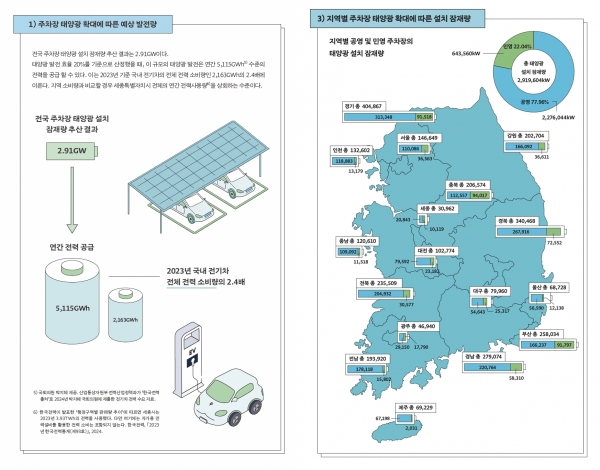 특히, 전국의 주차장만 활용하더라도, 국내 전기차 수요의 약 2.4배에 달하는 전기를 생산할 수 있는 태양광 발전시설을 설치할 수 있는 것으로 나타났다.