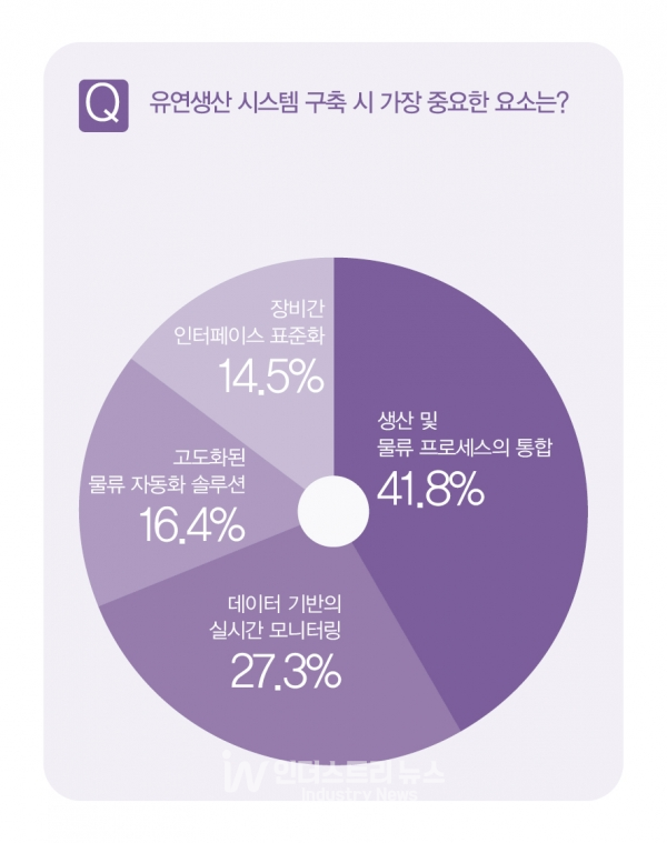 유연 생산시스템 구축 시 가장 중요한 요소를 묻는 질문에는 41.8%가 ‘생산 및 물류 프로세스의 통합’이라고 답했고, 27.3%가 ‘데이터 기반의 실시간 모니터링’, 16.4%가 ‘고도화된 물류자동화 솔루션’, 14.5%가 ‘장비간 인터페이스 표준화’를 선택했다.
