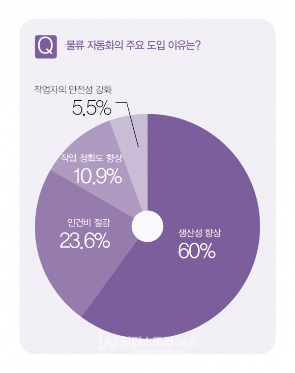 물류자동화의 주요 도입 이유로는 응답자의 60%가 ‘생산성 향상’을 꼽았다. 다음으로는 23.6%가 ‘인건비 절감’, 10.9%가 ‘작업 정확도 향상’, 5.5%가 ‘작업자의 안전성 강화’를 선택했다. 생산성 향상, 인건비 절감 등 단기간 내 가시화된 성과를 요구하는 것으로 해석된다.