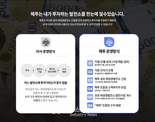 [인더스트리뉴스 정한교 기자] 해투협동조합(이하 해투)은 지난 7월부터 신재생에너지 소액투자자를 위한 ‘공유태양광발전소 참여사업’을 시작했다고 19일 밝혔다.