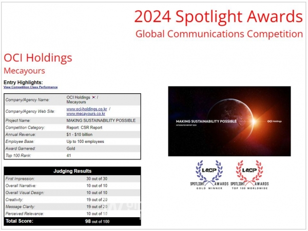 이는 지난해 5월 지주사로 출범한 OCI홀딩스의 첫 수상으로, 전 세계 출품작 가운데 41위를 차지하며 가장 우수한 보고서 TOP 100에도 선정됐다.