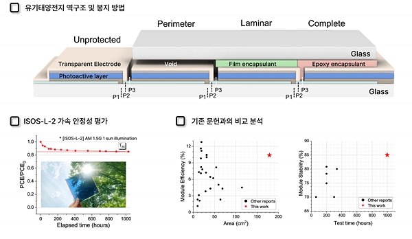 특히, 유기태양전지는 습기, 산소, 자외선 등 외부 환경에 민감해 시간이 지남에 따라 효율이 급격히 저하되는 내구성 문제가 있다. 기존 봉지화 방식은 이러한 스트레스 요인을 충분히 차단하지 못할뿐더러 일반적인 봉지재 적용 시 투과도를 크게 떨어뜨려 반투명 유기태양전지 상용화의 큰 장애물로 작용했다.