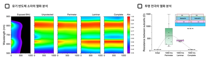 아울러 유기태양전지의 주요 열화 기작인 광산화와 전극 산화를 효과적으로 억제한 결과로, 초기 광변환 효율 감소율 10.37%에서 1,000시간 가속 열화 조건 테스트 후에도 8.8%를 유지하는 성과를 얻었다. 특히, 보고된 문헌에서는 약 4,00시간 이내에 20% 이상의 효율 감소를 보였으나, 이번 연구에서는 1,000시간 장시간 테스트에서도 15% 감소에 그치는 획기적인 개선 효과를 입증했다.