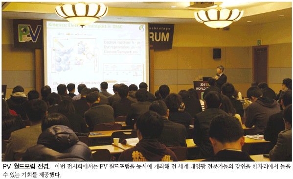 특히 이번 전시회에서는 전 세계 태양광 전문가들의 강연을 한자리에서 들을 수 있는 ‘2011 PV 월드포럼(World Forum)’과 태양광 기업들이 유망 인재를 채용하는 취업박람회 ‘2011 에너지 잡페어(Energy Job Fair)’, 그리고 전시회 참가기업의 신제품 및 신기술을 발표하는 ‘2011 신제품·신기술 발표 세미나(New Technology & Product Presentation)’ 등이 동시 개최되었다. 이러한 부대행사들을 통해 참가기업과 참관객간의 소통의 장을 열어줌으로써 태양광산업 발전에 많은 기여를 할 것으로 기대된다.