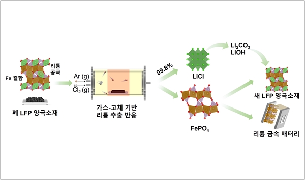 연구팀에 따르면, LFP폐배터리를 분해하면 나오는 분말 형태의 양극 소재를 염소 기체와 200℃에서 10분간 반응시키면 리튬이 염화리튬(LiCl) 형태로 추출된다. 염화리튬은 상용화된 기존 변환 공정을 통해 탄산리튬(Li2CO3)이나 수산화리튬(LiOH)으로 전환해 새로운 LFP배터리의 양극 소재 합성 원료로 다시 사용할 수 있다.