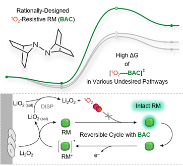 개발된 산화환원 매개체인 BAC(7,7′-bi-7-azabicyclo[2.2.1]heptane)는 일중항산소 노출 전후에 배터리 충전 전압을 3.5V 수준으로 동일하게 유지했으며, 충전 동안 방출되는 산소의 비율이 각각 82%와 79%로 뛰어난 안정성과 가역성을 가짐이 확인됐다.