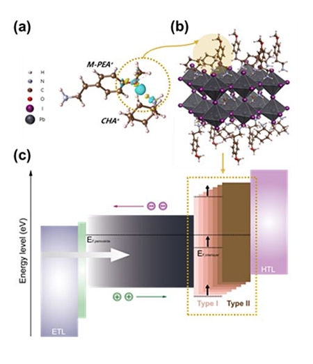 이를 해결하기 위해 기존에는 단일 유기 양이온을 사용하는 연구가 진행됐지만, 단일 유기 양이온의 이탈로 인한 박막 구조 붕괴와 에너지 준위 부조화라는 문제가 있었다. 에너지 준위는 전하가 이동하는 ‘계단’과 같은 경로로, 층간 에너지 준위가 어긋나면 전하 손실이 발생해 전지 효율이 떨어진다.