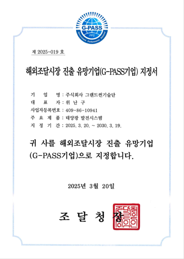 그랜드썬기술단 위난구 대표는 “그동안 해외 재생에너지 시장 진출을 목표로 지속적인 관심과 준비를 이어왔지만, 철저한 기반 마련을 우선시해 왔다”며, “이번 G-PASS 등급 획득은 그 준비 과정이 인정받은 결과로, 앞으로는 수출 인프라 구축과 해외 협력 네트워크 확대에 본격적으로 나서겠다”고 밝혔다.