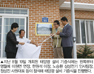 이날 기증식에는 태안군 이수연 부군수, 볏가리마을 한원석 이장과 주민, 삼성전기 인사팀장 노승환 상무, 정성진 사원대표 및 임직원 100여명이 참석했다. 삼성전기가 기증한 태양광발전 설비는 3kW 급으로 마을의 정보화교실과 관광객 숙소로 사용되는 마을회관에 설치됐고, 볏가리마을에서는 에너지 절감비용을 마을 복지사업에 재투자할 계획이다.