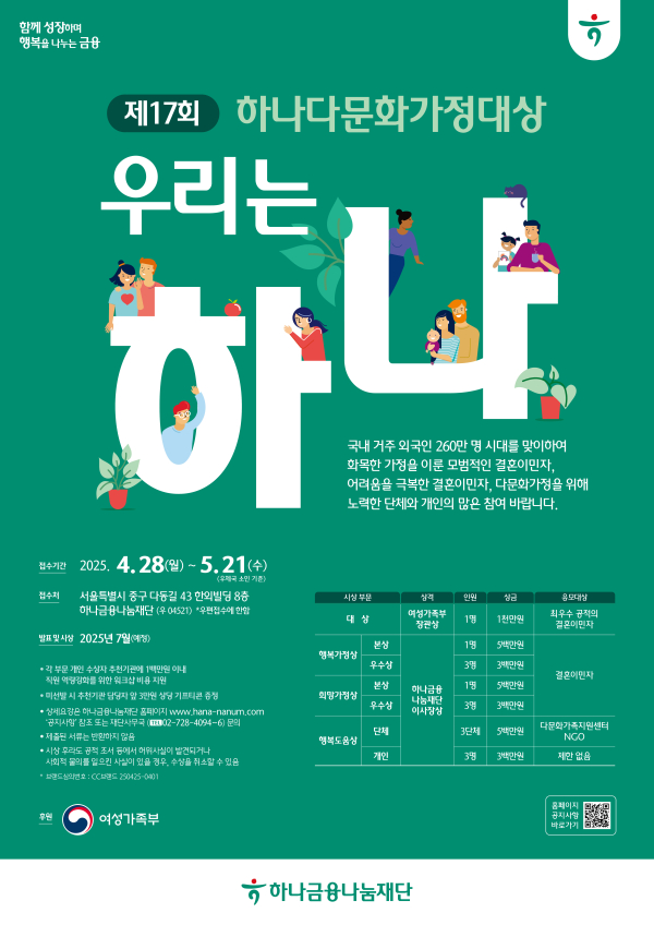 [인더스트리뉴스 홍윤기 기자] 하나금융나눔재단은 오는 21일까지 여성가족부가 공식 후원하는 '제17회 하나다문화가정대상' 수상 후보자를 공모한다고 8일 밝혔다.