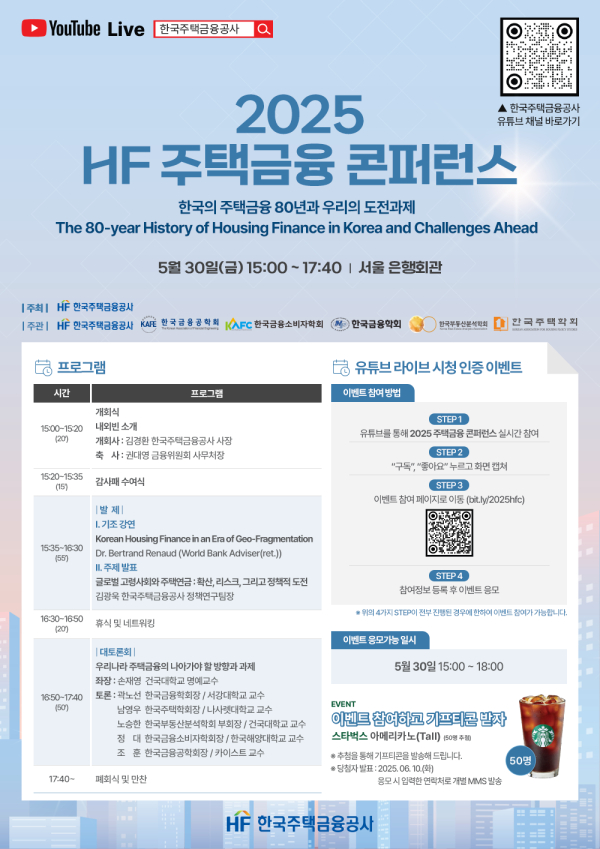 [인더스트리뉴스 김은경 기자] 한국주택금융공사(사장 김경환)는 ‘2025 HF 주택금융 컨퍼런스’를 오는 30일 서울 명동 은행회관에서 개최한다고 21일 밝혔다.