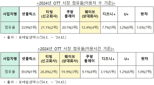 실제로 지난해 OTT 시장 점유율은 이용자 수 기준 △넷플릭스(33.9%) △티빙(21.1%) △쿠팡플레이(20.1%) △웨이브(12.4%) 순이었고, 이용시간 기준으로는 △넷플릭스(39.0%) △티빙(26.8%) △웨이브(19.9%) △쿠팡플레이(9.1%) 등이었다.