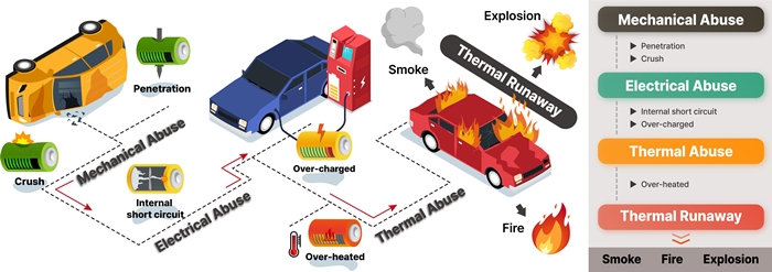 최근 전기자전거나 전동킥보드 등의 소형 모빌리티 기기에서 충전 중 폭발이 발생하는 등 리튬이온배터리의 안전성에 대한 우려가 지속되고 있다. 이러한 사고의 주요 원인 중 하나는 열폭주(Thermal Runaway) 현상으로, 외부 충격이나 과열로 인해 배터리 내 화학 반응이 가속되면서 자가 발화나 폭발로 이어진다. 특히, 리튬이온배터리에 사용되는 카보네이트계 유기 전해질은 상온에서도 쉽게 인화돼 직접적인 발화 요인이 되기도 한다.