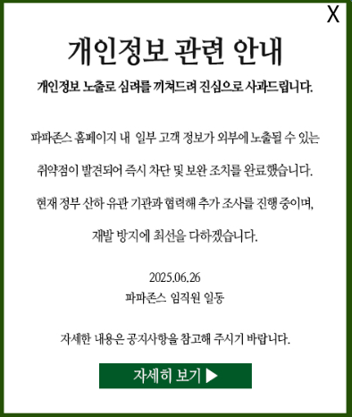 한국파파존스는 이날 자사 홈페이지 공지문을 통해 “홈페이지 내 일부 고객 정보가 외부에 노출될 수 있는 보안 취약점이 발견돼 즉시 차단 및 보완 조치를 완료했다”며 “현재 정부 산하 유관 기관과 협력해 추가 조사를 진행 중이며, 재발 방지에 최선을 다하겠다”고 밝혔다.