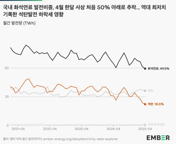글로벌 에너지 싱크탱크 엠버(Ember)가 2일 발표한 분석에 따르면, 2025년 4월 한국의 전력 생산에서 화석연료 비중이 49.5%(21.8TWh)로 떨어지며 월간 기준으로 사상 처음 절반 이하를 기록했다. 이는 2024년 5월에 기록했던 50.4%(22.6TWh)를 밑도는 최저치다.