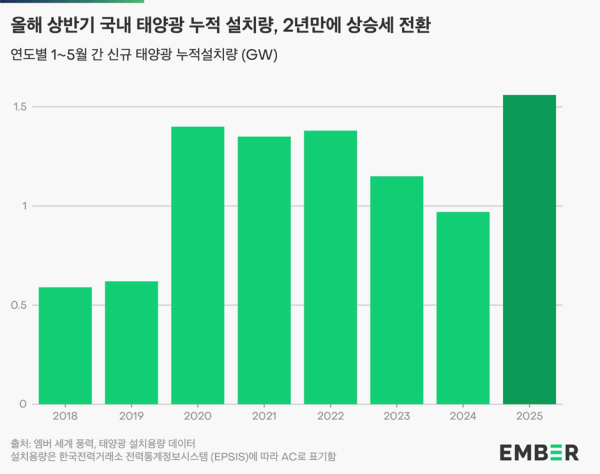 발전량은 4TWh로, 2021년 4월(2.3TWh)의 거의 두 배에 이른다. 같은 해 1~5월 설치된 신규 태양광 설비는 1.56GW로, 전년 동기 대비 61% 증가하며 2년간 이어진 감소세를 반전시켰다.