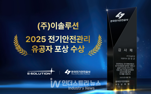이솔루션(대표 권진근)은 산업통상자원부 산하기관인 한국전기안전공사가 주관하는 ‘2025 전기안전관리 유공자 포상’에서 전기안전공사 사장 표창을 수상했다고 밝혔다.