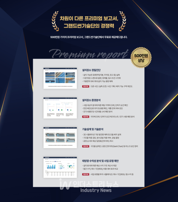 [인더스트리뉴스 정한교 기자] 그랜드썬기술단(대표 위난구)이 태양광사업 초기 검토 단계에서 필요한 기술·경제성 분석을 포함한 현장 실사 기반 ‘프리미엄 보고서’를 정식 비즈니스 상품으로 출시했다고 지난 7일 밝혔다.