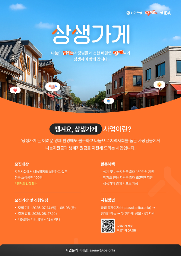 [인더스트리뉴스 홍윤기 기자] 신한은행은 소상공인의 매출 확대와 지역사회 소외계층을 위한 나눔 문화를 확산하기 위해 ‘땡겨요, 상생가게’ 2025년도 사업을 추진한다고 14일 밝혔다.