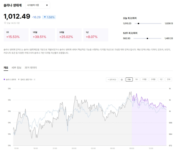 [인더스트리뉴스 김은경 기자] 업비트를 운영하는 두나무(대표 오경석)가 투자자들의 시장 이해를 돕기 위해 ‘솔라나 생태계 지수’와 ‘수이 생태계 지수’를 업비트 데이터랩에 새로 도입했다고 24일 밝혔다.