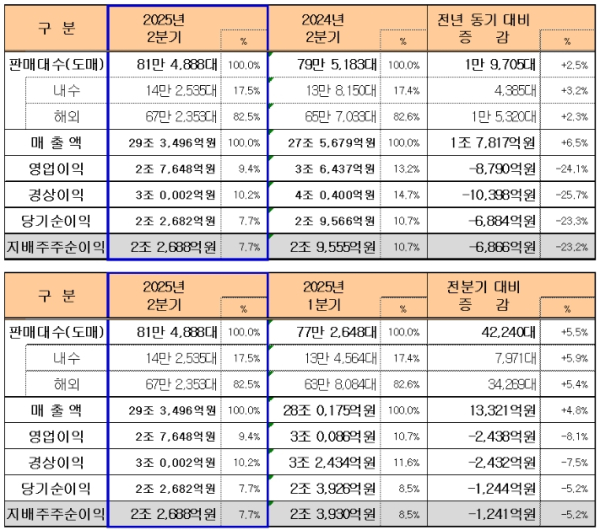 2분기 글로벌 판매량은 전년 동기 대비 2.5% 증가한 81만4888대를 기록했다. 국내에서 14만2535대, 해외에서 67만2353대를 팔았다.