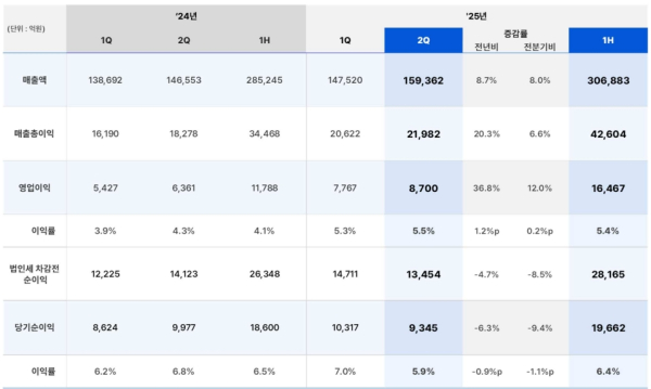 상반기(1~2분기) 누적 영업이익은 1조6467억원으로 전년 동기 대비 39.7% 늘었다. 누적 매출은 30조6883억원으로 7.6% 증가했고, 순이익은 1조9662억원 5.7% 신장했다.