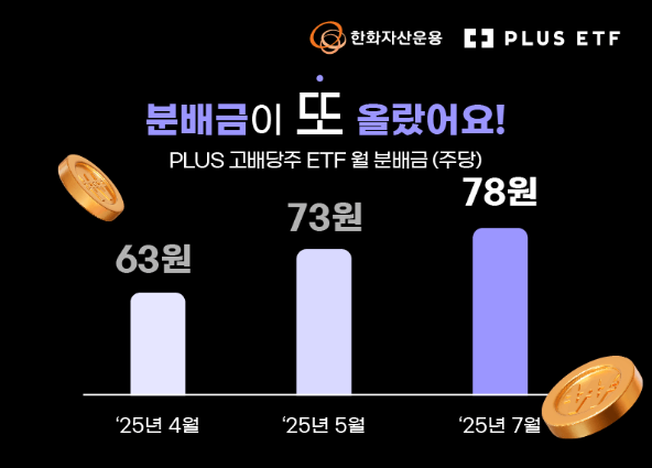 [인더스트리뉴스 김은경 기자] 한화자산운용(대표이사 김종호)이 ‘PLUS 고배당주’ ETF(상장지수펀드)의 주당 월 분배금을 78원으로 인상했다고 1일 밝혔다.