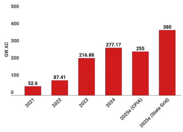 당초 경기 둔화 예측에도 불구하고, 2025년 중국 태양광 신규 설치용량을 전년 대비 35.5% 증가한 380GW AC로 예상했다. 이는 중국태양광산업협회(CPIA)가 내놓은 예측보다 100GW 이상 높은 수치이다.
