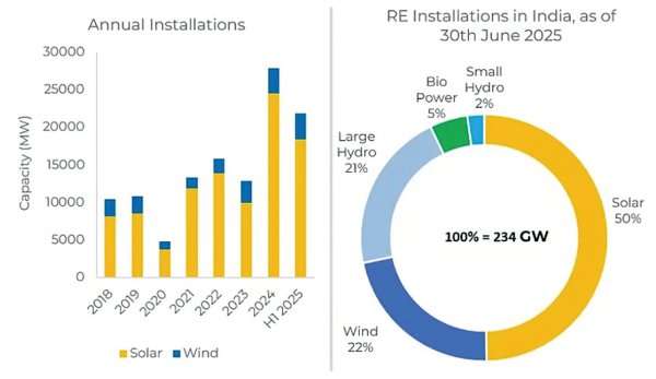 2025년 6월 말 기준으로 인도는 재생에너지 누적 설치용량 234GW에 도달했다. 태양광은 유틸리티 규모 89.3GW, 계통연계 지붕 태양광 18.8GW, 하이브리드형 3.1GW, 독립형 5.1GW를 포함해 총 116.2GW의 누적 설치용량을 기록하며 재생에너지 누적 설치용량의 50%를 차지했다. 이에 비해, 풍력은 22%, 대수력은 21%, 바이오 발전은 5%, 소수력은 2%의 점유율을 차지했다.