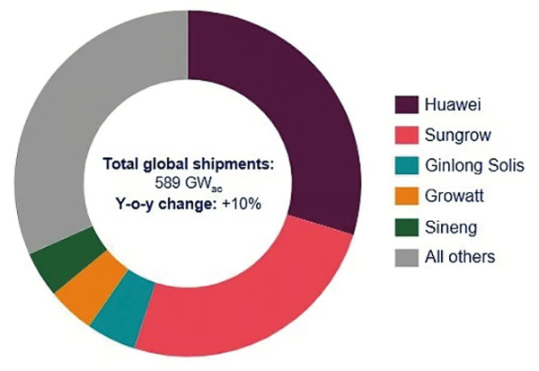중국의 화웨이(Huawei)와 선그로우가 각각 출하량 176GW와 148GW를 기록하며 10년 연속 1, 2위 자리를 유지했다. 두 기업의 글로벌 점유율은 무려 55%나 된다. 화웨이는 중국, 유럽, 라틴 아메리카, 아프리카에서 점유율 1위를 차지했고, 선그로우는 미국, 인도, 중동 지역에서 1위를 차지했다. 중국의 진롱 솔리스(Ginlong Solis)는 3위를 유지했고, 중국 그로와트(Growatt)가 4위를 탈환하며 2022년 순위를 회복했다. 상위 10개 기업 중 9개 기업이 중국 기업이고, 독일 SMA가 유일한 비중국 TOP10 기업으로서 체면을 유지했다.