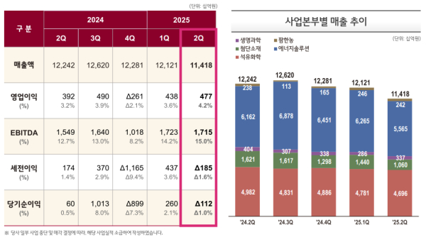 사업부문별로 보면 석유화학 부문은 매출 4조6962억원, 영업손실 904억원을 기록했다.