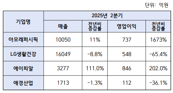 아모레퍼시픽은 채널 다변화와 브랜드 경쟁력 강화로 중국 실적을 회복한 반면, LG생활건강과 애경산업은 중국 소비 침체와 유통 재정비에 발목이 잡혔다는 진단이 나온다.