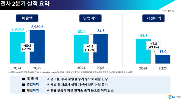 GS리테일 관계자는 “수익성과 내실 경영을 강화하며 어려운 업황 극복에 주력한 결과, 매출과 영업이익이 모두 늘었고 특히 영업이익은 시장 기대치를 크게 상회하는 실적을 기록했다”며 “앞으로도 고객 중심의 상품과 서비스를 강화하고 내실 다지기에 집중하는 등 지속 가능한 사업 성장에 매진할 것”이라고 말했다.