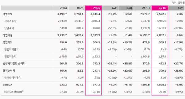 서비스수익 대비 마케팅비용 비중은 전년 동기와 유사한 19.2%로 효율적인 집행을 이어가고 있다. CAPEX(설비투자)는 지난해 2분기에 비해 29.4% 감소한 3933억원을 집행했다.