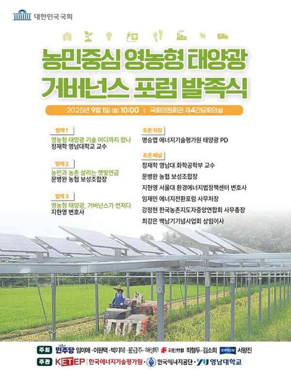 본 포럼은 국회가 주최하고, 필자가 간사(총무)를 맡고 있다. 한국에너지기술평가원, 한국에너지공단, 영남대학교가 주관하며 농림축산식품부, 산업통상자원부(기후에너지환경부) 등의 관계부처를 포함하여 농민단체·농협·농어촌공사 등 농림축산식품부 유관기관, 영농형 태양광 산업계와 관련 협단체, 한국전력 등 계통관련 공기업, 에너지전환포럼 등 다양한 이해관계자가 참여한다.