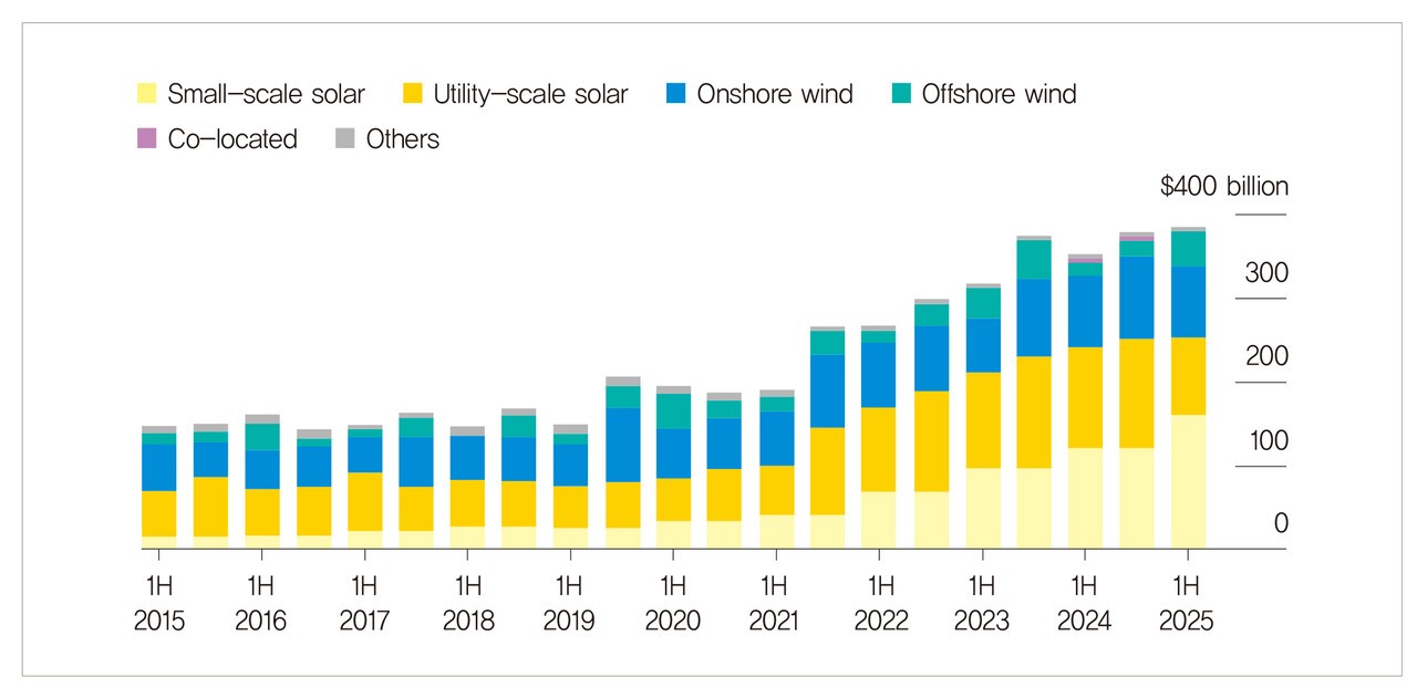 BNEF의 최신보고서(2H 2025 Renewable Energy Investment Tracker)에 따르면, 2025년 상반기 글로벌 재생에너지 투자는 전년동기 대비 10% 증가한 3,860억 달러($)를 기록했다. 이 중 태양광이 약 65%인 2,500억 달러 수준을 차지했다. 소규모 태양광과 해상풍력이 투자를 주도했다.