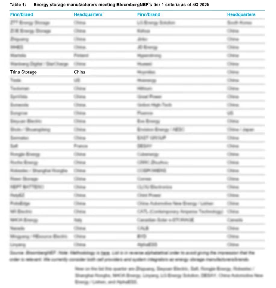 [인더스트리뉴스 정한교 기자] 글로벌 선도 에너지저장 솔루션 제공업체 트리나스토리지(Trina Storage)는 블룸버그NEF (BloombergNEF, BNEF)의 2025년 4분기 에너지저장장치(ESS) 제조기업 티어 1(Tier 1) 명단에 이름을 올렸다고 지난 20일 밝혔다.