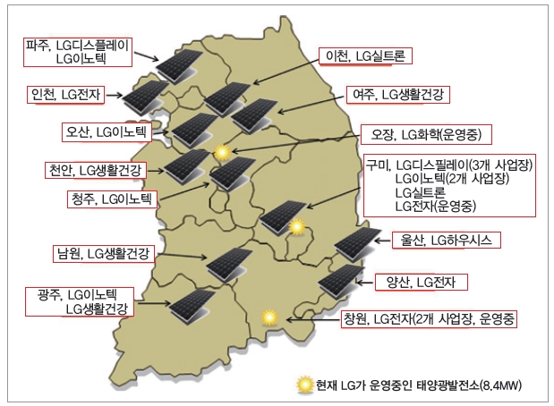 이번 지붕형 태양광발전 프로젝트에도 모듈기준 국내 최고 수준의 출력과 효율의 LG전자 태양광 모듈이, 태양광 모듈로부터 생산된 직류전력을 교류로 전환해 전력망에 연결하는 데는 LG유플러스의 전력변환장치(PCS)가 적용된다. LG는 또 올해 중반경 착공에 들어가는 첨단 융복합 R&D 기지인 마곡 LG 사이언스 파크를 첨단 에너지 솔루션 사업 역량을 집결한 플래그십 모델로 건설키로 한 바 있다.