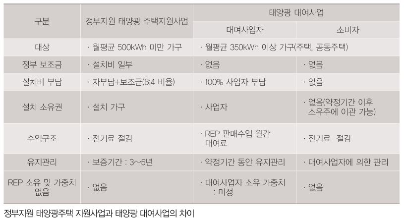 즉, 사용자가 무상으로 태양광 대여사업자로부터 태양광 설비를 빌려 쓰고 절약된 금액으로 매월 대여료를 납부하며, 대여 사업자는 대여료와 REP로 투자금을 회수하는 방식이다.