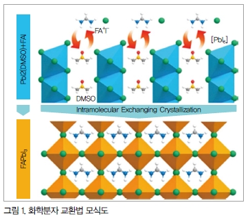 그 반면, 이번 연구진이 개발한 ‘화학분자 교환법’은 PbI2(DMSO) 박막을 우선적으로 기판상에 형성하는 것이 핵심이다. PbI2(DMSO)는 층상 구조를 갖고 있는 PbI2 층간에 DMSO 분자가 삽입된 형태의 결정 구조를 갖는 물질로 추정된다.