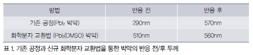 실제로 기존 공정과 화학분자 교환법에 의해 형성된 FAPbI3막의 반응 전후 두께를 비교해 보면, 표 1과 같이 기존 방법의 경우 두께가 2배 정도 증가하는 데 비해, 신규 화학분자 교환법은 미미한 두께 증가만을 보임을 알 수 있다. 이는 FAI가 이미 삽입돼 있는 DMSO을 교환해 FAPbI3상을 형성하므로 부피의 팽창이 미미하다는 사실을 말해준다. 이로써 박막 형성시 막에 가해지는 응력을 최소화할 수 있으므로 크랙이나 깨지는 현상이 없는 고품질 박막 형성에 크게 기여한 것으로 보인다. 화학분자 교환법에 의해 형성된 박막은 열처리를 하지 않더라도 FAPbI3 결정막이 형성됐으며, 이 결정막은 한쪽 결정학적 방향으로 결정이 배열돼 있는 고결정성 특성을 보였다. 또한 기존의 방법에 비해 더 매끈한 표면과 더 큰 결정립 크기를 갖는 것으로 분석됐다.