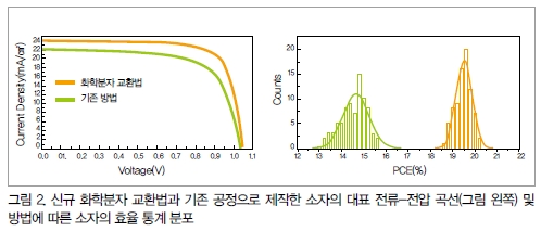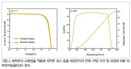 이러한 박막 형성 방법을 적용해 FAPbI3를 5mole%의 MAPbBr3로 치환한 고품질 페로브스카이트 박막을 형성할 수 있었다. 이를 적용한 페로브스카이트 태양전지는 그림 2와 같이, 기존 방법에 비해 우수한 광전변환 특성을 보였을 뿐 아니라, 높은 평균 효율과 더 우수한 재연성을 보였다. 또한 그림 3과 같이, 화학분자 교환법을 적용한 페로브스카이트 태양전지는 최고 20.2%의 효율을 보였으며, 현재는 공정 최적화 작업을 통해 21%가 넘는 효율을 보이고 있다. 이는 1.5eV 정도로 낮아진 밴드갭에 기인한 높은 전류 밀도값(24.7mA/cm2)에 의한 것으로, 연구 논문에서는 그 효율이 20.1%로 세계 최고 공인 효율을 기록했다.