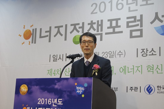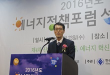 | 한국에너지공단 강남훈 이사장이 2016 에너지 정책포럼 성과 발표회에서 인사말을 하고 있다. | ||