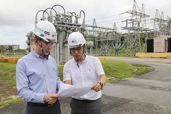 | LG CNS 김영섭 사장(사진 왼쪽)이 괌 ESS시스템 구축 현장을 사전 점검하고 있는 모습. 사진 뒷편은 괌 아가나(Agana) 변전소 전경. (자료 : LG CNS) |
