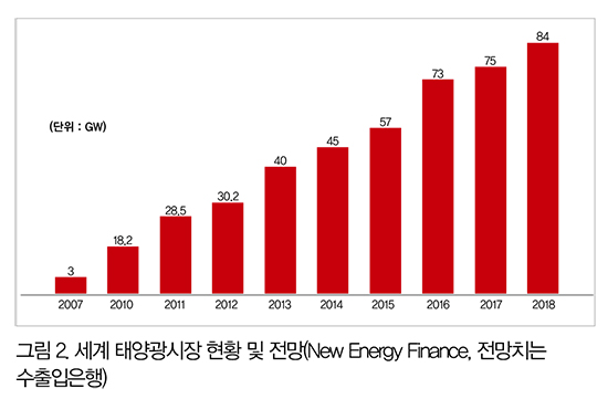 | 그림2. 세계 태양광시장 현황 및 전망(New Energy Finance, 전망치는 수출입은행) |